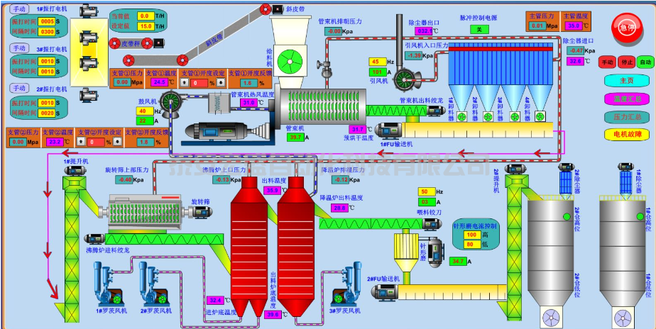 通訊模塊將沸騰爐進口油溫、進料粉溫、出口油溫、出口粉溫、爐膛溫度及羅茨風機風量等模擬量信號上傳到上位機。在上位機上對各部分的溫度、風量以及整條生產(chǎn)線的運行過程進行監(jiān)。在料倉上裝有料位傳感器,料位傳感器把料位信號送入PLC,當料位過低或過高時PLC可對值班人員發(fā)出報警提示,將該生產(chǎn)線統(tǒng)一成一個有效的整體。上位機組態(tài)軟件還設(shè)有數(shù)據(jù)報表功能,可以反應(yīng)生產(chǎn)過程中的數(shù)據(jù)、狀態(tài)等,并對數(shù)據(jù)進行記錄。既能反映生產(chǎn)線實時的生產(chǎn)情況,也能對長期的生產(chǎn)過程進行統(tǒng)計、分析,使生產(chǎn)工作人員能夠?qū)崟r掌握和分析生產(chǎn)情況,并可以制作實時報表和歷史報表。對實時報表和歷史報表可進行分析和打印。優(yōu)良的監(jiān)控畫面可以使的管理更加輕松,控制更加完美,也是現(xiàn)代型管理企業(yè)的管理手段。通過監(jiān)控畫面可以總攬全局、保證產(chǎn)品質(zhì)量,還能及時發(fā)現(xiàn)設(shè)備故障和設(shè)備的運行情況。報表的打印可以統(tǒng)計原材料消耗和成品產(chǎn)量,更加方便的對生產(chǎn)進行管理。