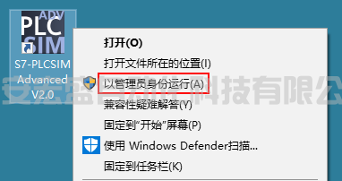 2. 右鍵點(diǎn)擊桌面上的S7-PLCSIM Advanced V2.0圖標(biāo),選擇”已管理員身份運(yùn)行”: