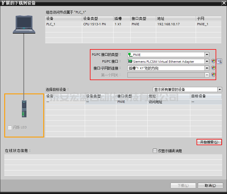9. 在左側(cè)項(xiàng)目樹(shù)中選擇PLC,單擊工具欄上的“下載”按鈕,在彈出的“擴(kuò)展的下載到設(shè)備”對(duì)話(huà)框中,“PG/PC接口的類(lèi)型”選擇“PNIE”、“PG/PC接口”選擇“Siemens PLCSIM Virtual Ethernet Adapter”、“接口/子網(wǎng)的連接”選擇PLC實(shí)際的接口,單擊“開(kāi)始搜索”按鈕: