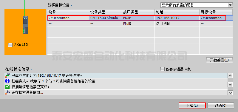 10. 系統(tǒng)可以搜索到之前創(chuàng)建的虛擬PLC,選中這個(gè)條目,單擊“下載”按鈕: