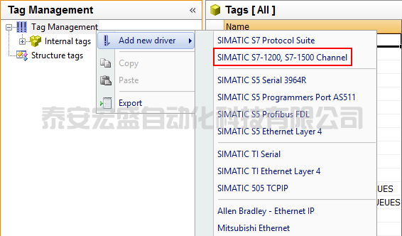 19. 在打開(kāi)的變量管理器中,右鍵單擊Tag Management,選擇Add new driver下的SIMATIC S7-1200,S7-1500 Chanel:
