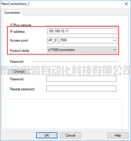 22. 填寫(xiě)PLC的參數(shù),如IP地址為仿真PLC的IP地址:192.168.10.17,訪(fǎng)問(wèn)點(diǎn)選擇之前創(chuàng)建的AP_S7_1500,產(chǎn)品家族選擇s71500-connection,然后單擊確認(rèn)按鈕: