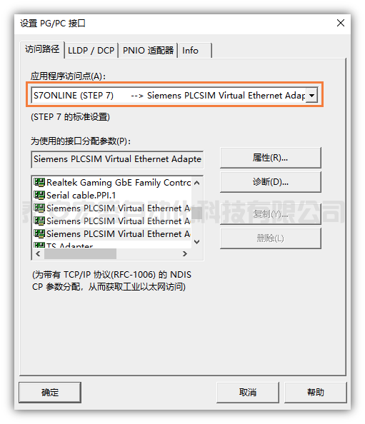 (8)下載PLC程序時,將PG/PC接口設(shè)置成Siemens PLCSIM Virtual Ethernet Adapter。