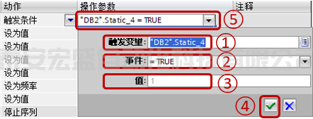 ②設(shè)置觸發(fā)事件,位變量支持"=True"和"=False",位序列和整數(shù)支持"=值"、"<>值",浮點(diǎn)數(shù)支持">值"、"<值"。