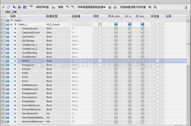 5.將EnHSC變量的值設(shè)置為1,也就是高速計(jì)數(shù)器的軟件門使能,如下圖所示。