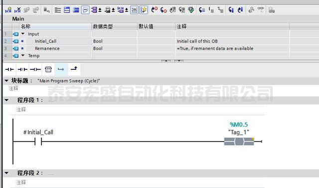 6.雙擊打開(kāi)OB1程序塊,在OB1第一個(gè)掃描周期將M0.5置位,如下圖所示。
