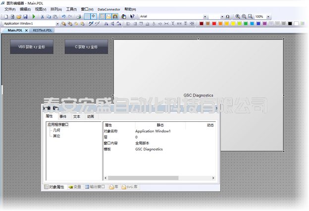 首先在畫面中添加兩個按鈕以及一個應用程序窗口(窗口內(nèi)容:全局腳本;模板:GSC Diagnostics)。