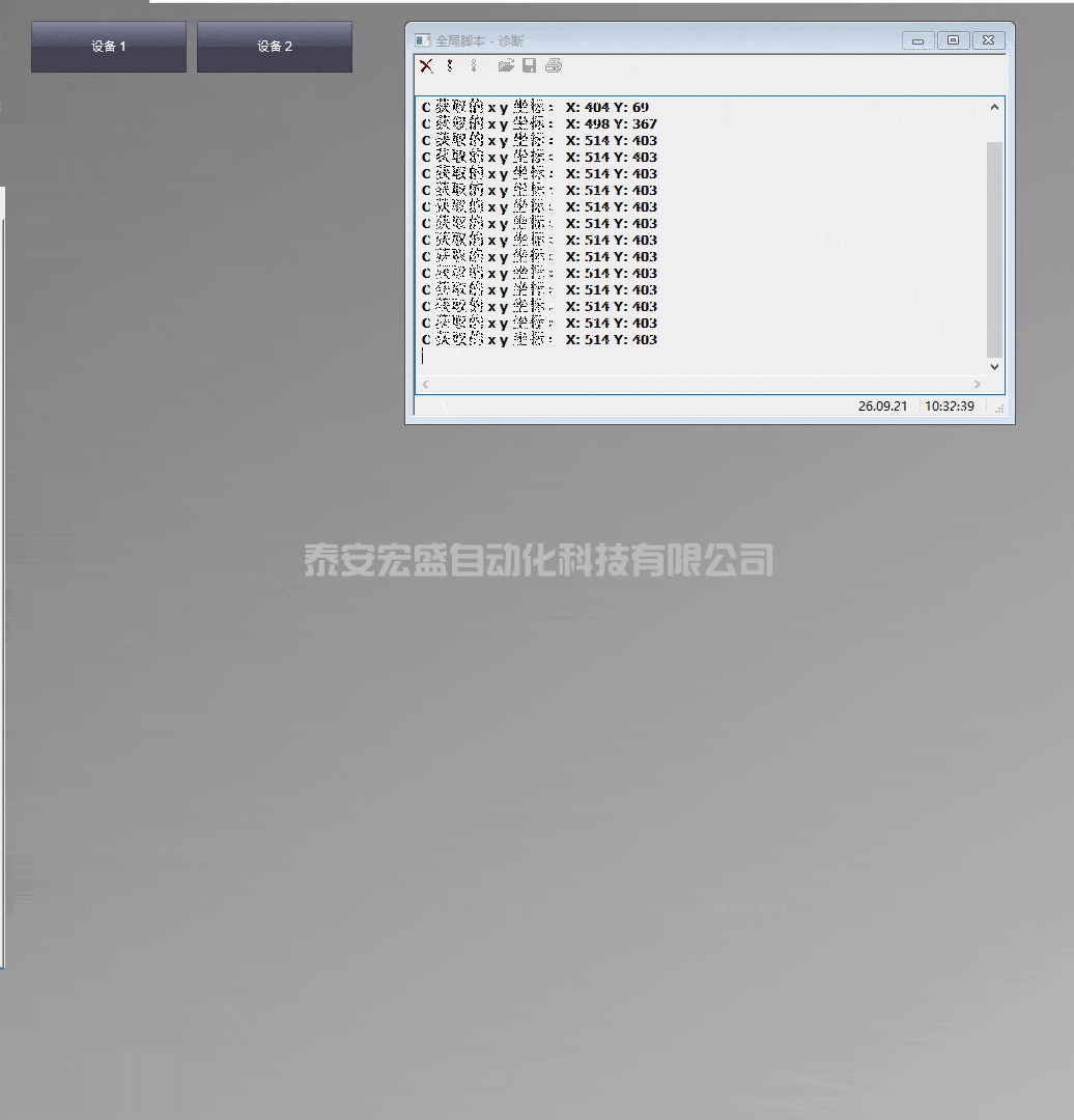 激活 WinCC 運行系統(tǒng)后,在畫面中鼠標分別按下兩個按鈕后,應用程序窗口中將會輸出鼠標按下時的 x,y 坐標值。