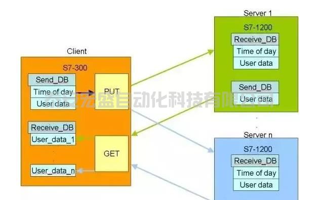 主站和從站包含了發(fā)送和接收塊(Send_DB和Receive_DB)。在接收到同步命令之后,主站讀取系統(tǒng)時(shí)間,并通過(guò)PUT塊將此信息和用戶數(shù)據(jù)發(fā)送到第一個(gè)從站,以進(jìn)行S7通信。PUT塊將它自己的系統(tǒng)時(shí)間與從主站中接收到的日時(shí)鐘鐘信息進(jìn)行同步。然后主站通過(guò)GET通信塊獲得從站1的用戶數(shù)據(jù)。之后將從站1的此用戶數(shù)據(jù)存儲(chǔ)在主站接收塊的相關(guān)位置中。對(duì)所有后續(xù)從站單元重復(fù)此過(guò)程。在完成主站和最后一個(gè)從站之間的數(shù)據(jù)交換之后,主站單元重新啟動(dòng)與從站1的數(shù)據(jù)交換。