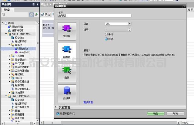 2.雙擊“項(xiàng)目樹”-“PLC_1”-“程序塊”下的“添加新塊”,彈出添加新塊對(duì)話框,在對(duì)話框中選擇FB函數(shù),修改名稱,并將語言修改為SCL,單擊“確定”按鈕,完成程序塊的添加,如下圖所示。