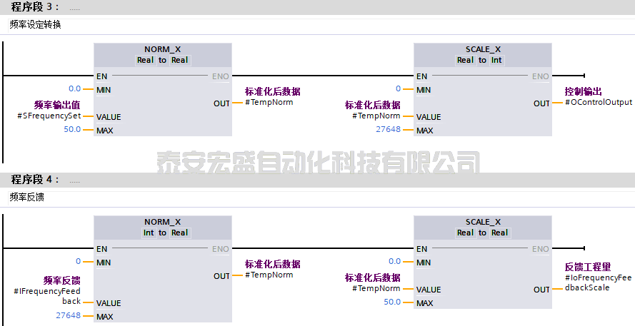 ③程序段3:使用標(biāo)準(zhǔn)化指令設(shè)定變頻器頻率和采集反饋的頻率。