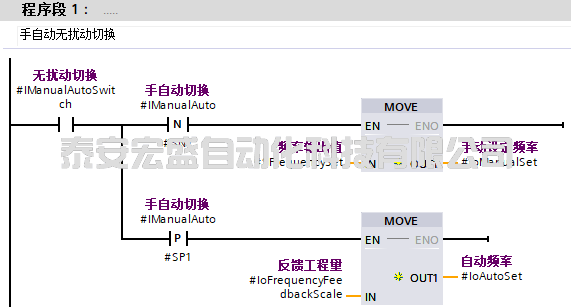 ①程序段1:當(dāng)HMI上“無擾切換”按鈕為TRUE時(shí),則是啟動無擾切換模式。此時(shí)HMI上的“手自動切換”按鈕,由自動轉(zhuǎn)換為手動模式檢測這個(gè)按鈕狀態(tài)下降沿,檢測到下降沿后,將頻率的輸出值賦值給手動設(shè)定頻率;由手動轉(zhuǎn)換為自動模式檢測這個(gè)按鈕狀態(tài)上升沿,檢測到上升沿后,將頻率的反饋值賦值給自動頻率。