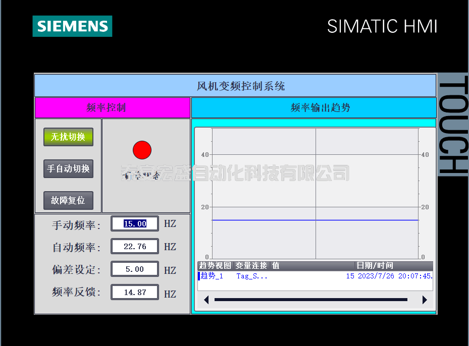 ②如圖3所示:HMI上“無擾切換”切換模式啟用;“手自動切換”為FALSE,代表的是手動模式;手動頻率給定的是15HZ,頻率輸出曲線一直是在15HZ。當(dāng)切換到自動模式,如圖4所示,頻率反饋的值給到自動頻率值,曲線可以看出頻率輸出沒有產(chǎn)生擾動。