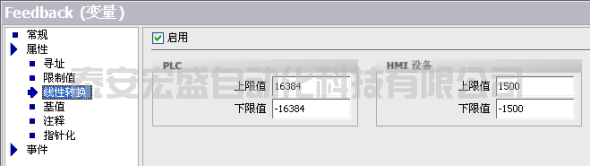 速度反饋值變量Feedback也是由-16384(-4000H)到+16384(+4000H)來(lái)表示-50Hz到+50Hz的轉(zhuǎn)速,此處也采用變量的線性轉(zhuǎn)換屬性,將-16384對(duì)應(yīng)-1500,+16384對(duì)應(yīng)+1500,如圖9所示。注意,圖9和圖7所示的線性轉(zhuǎn)換是一致的。