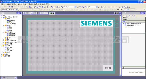 模板中的對(duì)象在選擇使用模板的畫面中會(huì)顯示出來(lái),此處把西門子的LOGO和退出Runtime的按鈕放置在模板中,如圖11所示。