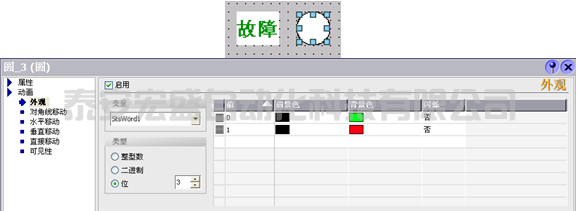 故障指示燈用來(lái)指示變頻器是否處于故障狀態(tài),連接變量為StsWord1的第3位,故障時(shí)顯示紅色,非故障時(shí)顯示綠色。其外觀動(dòng)畫設(shè)置如圖23所示。