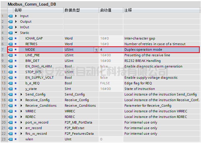 新版本的 Modbus RTU指令擴(kuò)展了Modbus RTU的功能,該指令除了支持CM1241通信模塊、CB1241通信板還支持 PROFINET 或 PROFIBUS 分布式 I/O 機(jī)架上的PTP通信模塊實現(xiàn)Modbus RTU通信。而分布式 I/O 機(jī)架上的PTP通信模塊可以支持多種工作模式,以ET200SP CM PtP模塊(訂貨號:6ES7137-6AA00-0BA0)為例,其可以支持RS232、RS485以及RS422等多種工作模式。Modbus_Comm_Load指令背景數(shù)據(jù)塊中的靜態(tài)變量“MODE”則用于定義PTP模塊的工作模式。“MODE”的默認(rèn)數(shù)值為0,代表“全雙工 (RS232)”工作模式,實際項目組態(tài)中則需要根據(jù)實際工作模式對該變量進(jìn)行修改。