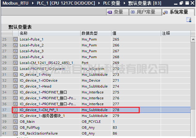 ②分布式IO 站點的硬件標(biāo)識符也可以在"PLC變量"--->"系統(tǒng)常數(shù)"中查詢。