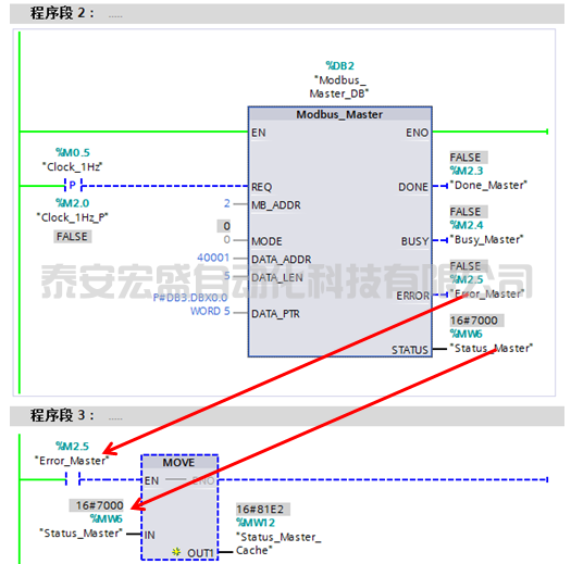 以Modbus_Master指令為例,當(dāng)通信出現(xiàn)錯誤時,Modbus_Master指令的“ERROR”輸出位將變?yōu)?TRUE 但是只保持一個掃描周期,所以通過TIA 軟件程序監(jiān)控時無法查詢到錯誤。Modbus_Master指令“STATUS” 參數(shù)中的錯誤代碼僅在“ERROR” = TRUE 的掃描周期內(nèi)有效,為了獲取了Modbus RTU通信錯誤的錯誤代碼我們可以采用下圖19. 方式編程。