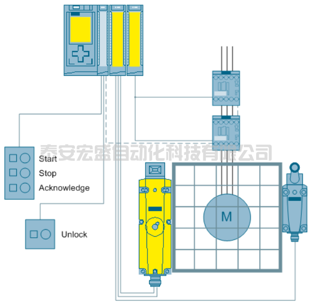 防護(hù)門位置的監(jiān)視由兩個(gè) SIRIUS 3SE5 位置開關(guān)執(zhí)行,可達(dá)到所需的安全級(jí)別。如果其中一個(gè)開關(guān)失效,另一個(gè)位置開關(guān)仍可檢測(cè)防護(hù)門是否開啟。而對(duì)于失效的位置開關(guān),控制器中的差異監(jiān)視功能將其檢出,并在故障排解之前保持其斷開。