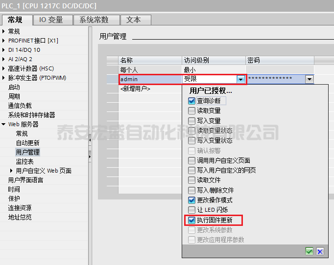 為了使能Web服務(wù)器升級固件功能,需要組態(tài)Web服務(wù)器訪問CPU的權(quán)限,需要在Web服務(wù)器屬性的“用戶管理”中添加授權(quán)的用戶名、訪問權(quán)限和密碼。