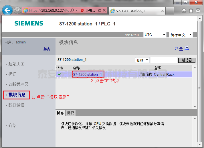 將上述的Web服務(wù)器組態(tài)下載到CPU后,授權(quán)用戶就可以通過Web服務(wù)器訪問CPU。