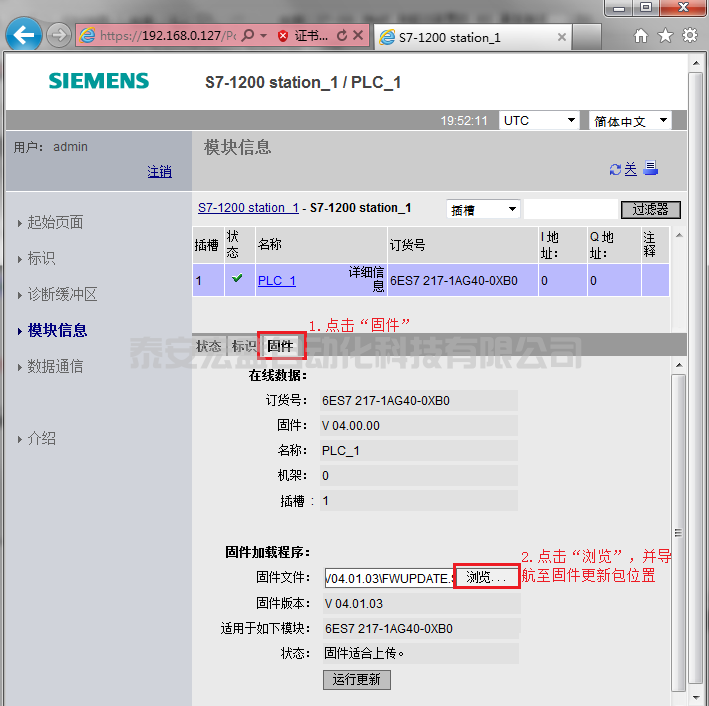 3.在PLC站點信息顯示頁面,點擊“固件”按鈕,并"瀏覽"至固件更新包,點擊“運(yùn)行更新”按鈕,即可執(zhí)行CPU固件更新操作。如圖8所示。