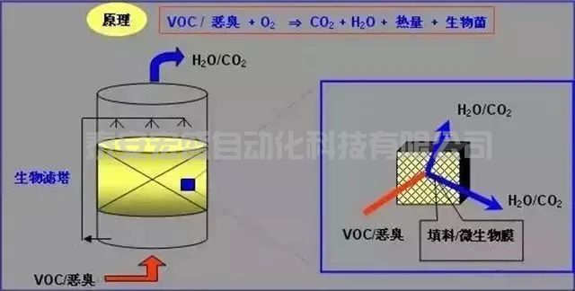生物滴濾法即:將廢氣經(jīng)過(guò)去塵增濕或降溫等預(yù)處理工藝后,從濾床底部由下向上穿過(guò)由濾料組成的濾床,廢氣由氣相轉(zhuǎn)移至水—微生物混和相,通過(guò)固著于濾料上的微生物代謝作用而被分解掉。