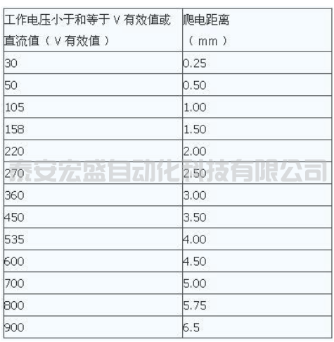根據工作電壓、絕緣等級及材料組別,查表(GB 4943 為表2L,65-2001 中為表11)確定爬電距離數值,如工作電壓數值在表兩個電壓范圍之間時,需要使用內差法計算其爬電距離。