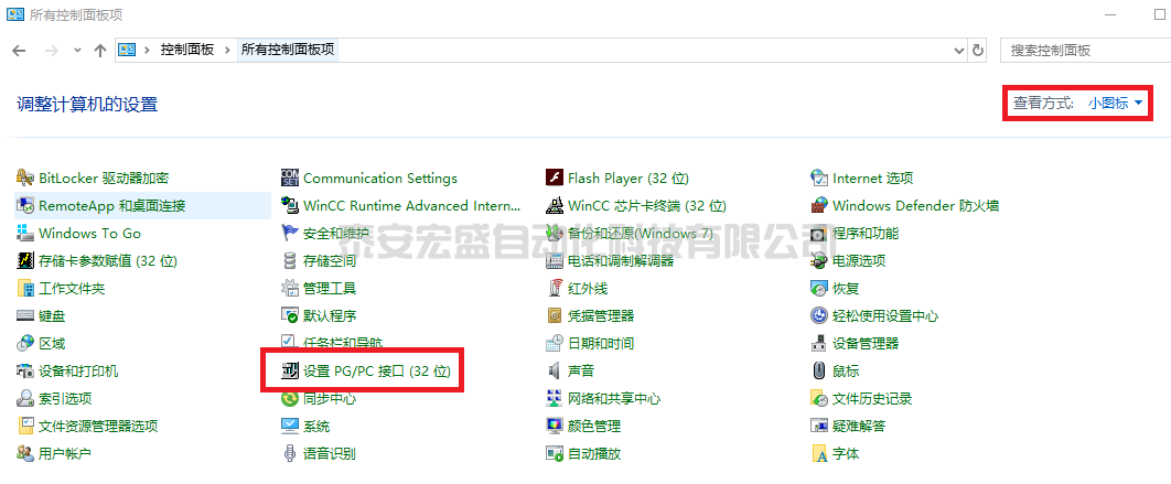 - 2.2 打開(kāi)電腦的控制面板,查看方式選擇小圖標(biāo),選中“設(shè)置 PG/PC 接口 (Set PG/PC Interface)”.