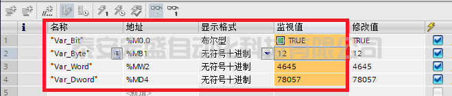 啟動(dòng)PLCSIM后,在PLC側(cè)監(jiān)控表中修改變量的數(shù)值。