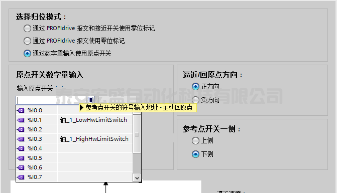 “通過數(shù)字量輸入使用原點(diǎn)開關(guān)”,并輸入開關(guān)地址。