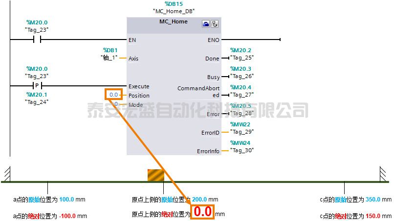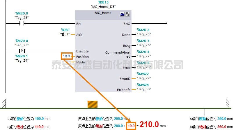 與Mode = 0 相同,以該模式觸發(fā) MC_Home 指令后軸并不運行,只是更新軸的當前位置值。更新的方式與 Mode = 0 不同,而是在軸原來坐標值的基礎上加上“Position”數(shù)值后得到的坐標值作為軸當前位置的新值。如下圖所示,指令 MC_Home 指令后,軸的位置值變成了 210mm.,相應的a和c點的坐標位置值也相應更新成新值。