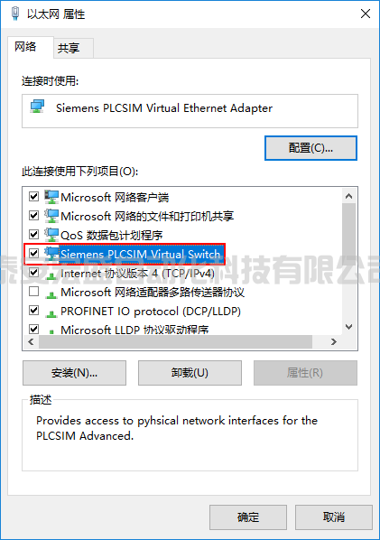 1) 安裝完成S7-PLCSIM Advanced之后,會(huì)在計(jì)算機(jī)上虛擬出一個(gè)網(wǎng)卡。注意在實(shí)際網(wǎng)卡與虛擬網(wǎng)卡的屬性中勾選Siemens PLCSIM Virtual Switch: