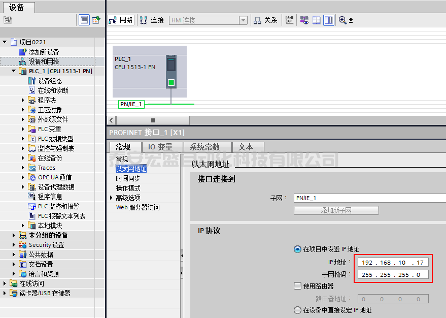 6. 在博途中打開(kāi)S7-1500 PLC的程序,在設(shè)備和網(wǎng)絡(luò)中設(shè)置PLC 網(wǎng)口的IP地址為192.168.10.17:
