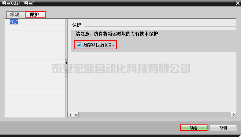8. 在彈出的對(duì)話(huà)框中選擇“保護(hù)”選項(xiàng)卡,務(wù)必勾選“塊編譯時(shí)支持仿真”,單擊確定按鈕關(guān)閉對(duì)話(huà)框: