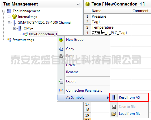 27. 也可以在項(xiàng)目激活的情況下,右鍵單擊NewConnection_1,選擇AS Symbols下的Read from AS,可以直接勾選需要在WinCC中使用的變量: