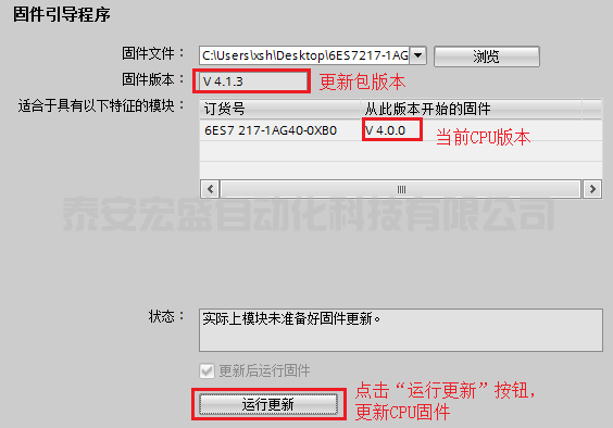 3.瀏覽到新版本固件后,點擊“運(yùn)行更新”按鈕,即可執(zhí)行更新CPU固件操作。如圖3所示。