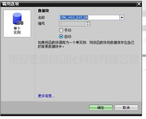 3.將指令拖入硬件中斷的程序編輯器,會(huì)產(chǎn)生如下圖所示的調(diào)用選項(xiàng),只能選擇單個(gè)實(shí)例,單擊“確定”按鈕。