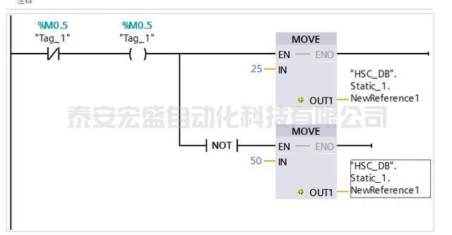 7.然后進(jìn)入中斷程序塊內(nèi)進(jìn)行編程,M0.5作為標(biāo)志位,該標(biāo)志位為1時(shí)指代參考值為25時(shí),為0時(shí)指代參考值為50時(shí)。