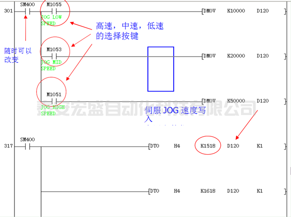 SM400一直處于接通狀態(tài),表示JOG的速度選擇可以通過開關(guān)的任意時間進(jìn) 行設(shè)定寫入從而改變。