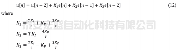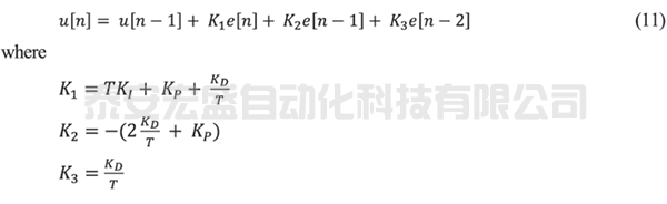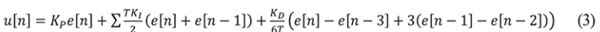 其中 u[n] 是當(dāng)前時間 n 的驅(qū)動值,e[n] 是時間 n 的調(diào)節(jié)誤差, e [n-1] 是前一采樣時間 n-1 的調(diào)節(jié)誤差。T 是采樣的時間段。相同的時間段 T 用于信號處理,即用于 u[n] 的計算。