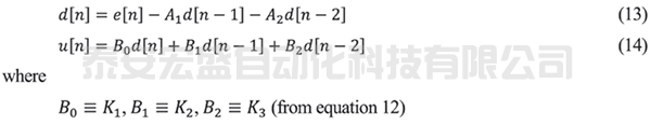 等式 9 和等式 10 適用于在 z 域中對控制系統(tǒng)建模(例如在 Matlab 中),但不能由任何控制器直接實現(xiàn)。然而,在對等式 9 進行 z 逆變換后,您將得到以下等式