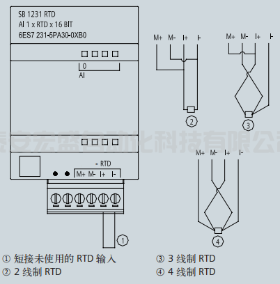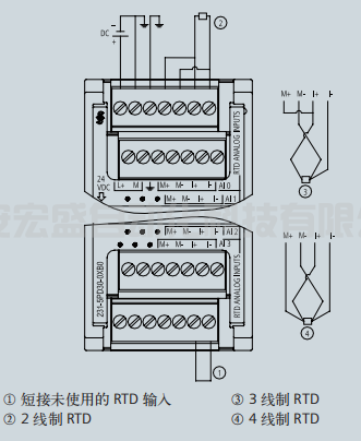 熱電阻模塊用于對熱電阻輸出的電阻信號進行接收,熱電阻模塊也有4AI和8AI兩種,下面以SM 1231RTD 4AI為例看一下接線圖。
