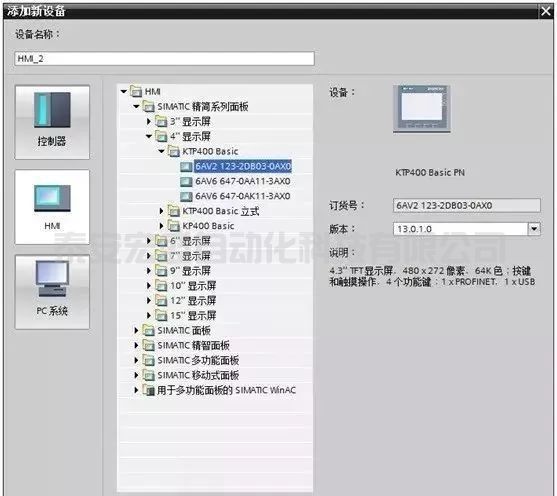 雙擊項(xiàng)目樹中的“添加新設(shè)備”,選中“添加新設(shè)備”對話框中的KTP400 Basic精簡面板,不要勾選“啟用設(shè)備向?qū)А睆?fù)選框。單擊“確定”按鈕確認(rèn)。