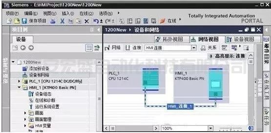 雙擊項(xiàng)目視圖中的“設(shè)備和網(wǎng)絡(luò)”,打開網(wǎng)絡(luò)視圖。單擊“連接”按鈕,自動選中“HMI連接”。用拖拽的方法連接HMI和PLC的PN接口,自動生成HMI_連接_1。