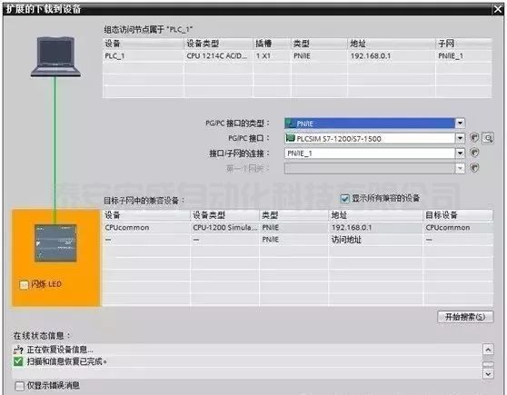 單擊“開始搜索”按鈕,“目標(biāo)子網(wǎng)中的兼容設(shè)備”列表中顯示出搜索到的仿真CPU的以太網(wǎng)接口的IP地址。