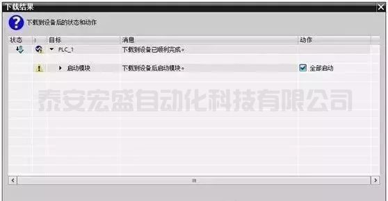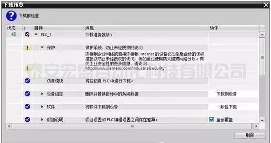 單擊“下載”按鈕,出現(xiàn)“下載預(yù)覽”對話框,勾選復(fù)選框“全部覆蓋”,編譯成功后,單擊“下載”按鈕,將程序下載到PLC。