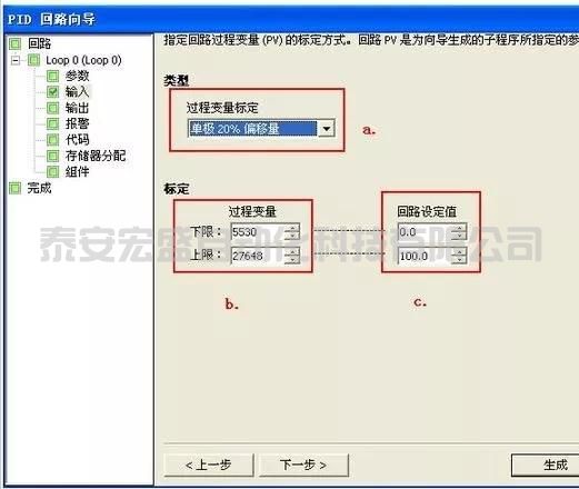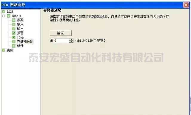 PID指令(功能塊)使用了一個120個字節(jié)的V區(qū)參數(shù)表來進行控制回路的運算工作;除此之外,PID向?qū)傻妮斎?輸出量的標(biāo)準(zhǔn)化程序也需要運算數(shù)據(jù)存儲區(qū)。需要為它們定義一個起始地址,要保證該地址起始的若干字節(jié)在程序的其它地方?jīng)]有被重復(fù)使用。如果點擊“建議”,則向?qū)⒆詣訛槟阍O(shè)定當(dāng)前程序中沒有用過的V區(qū)地址。