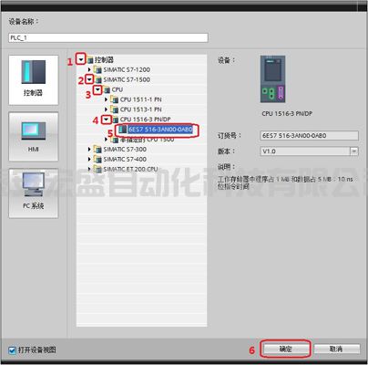 5.接下來(lái)我們先插入一個(gè)CPU1516-3PN/DP:請(qǐng)依次點(diǎn)擊“控制器”、“SIMATIC S7-1500”、“CPU”、“CPU 1516-3PN/DP”左側(cè)的小箭頭展開項(xiàng)目樹,然后選擇PLC訂貨號(hào)“6ES7 516-3AN00-0BA0”,最后點(diǎn)擊“確認(rèn)”按鈕插入: